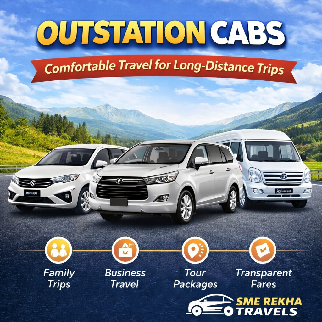 SME Rekha Travels offers dependable and affordable outstation cab services for smooth and stress-free long-distance journeys. Whether you’re planning a weekend getaway, a family trip, a pilgrimage, or a business visit, we provide comfortable rides to your destination with complete safety and convenience. Our fleet includes well-maintained sedans, SUVs, tempo travellers, mini buses, and buses, suitable for individuals, families, and group travel. With experienced drivers, transparent pricing, and 24/7 availability, we ensure your outstation travel is comfortable and on time.